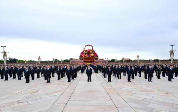 纪念碑前,2400多名各界代表手持鲜花,列队肃立。他们中有耄耋之年的老战士、老同志,有胸前佩戴着红飘带的烈士亲属,有国家勋章和国家荣誉称号获得者代表,有受表彰的民族团结进步模范代表,有朝气蓬勃的青年学生和少年儿童。